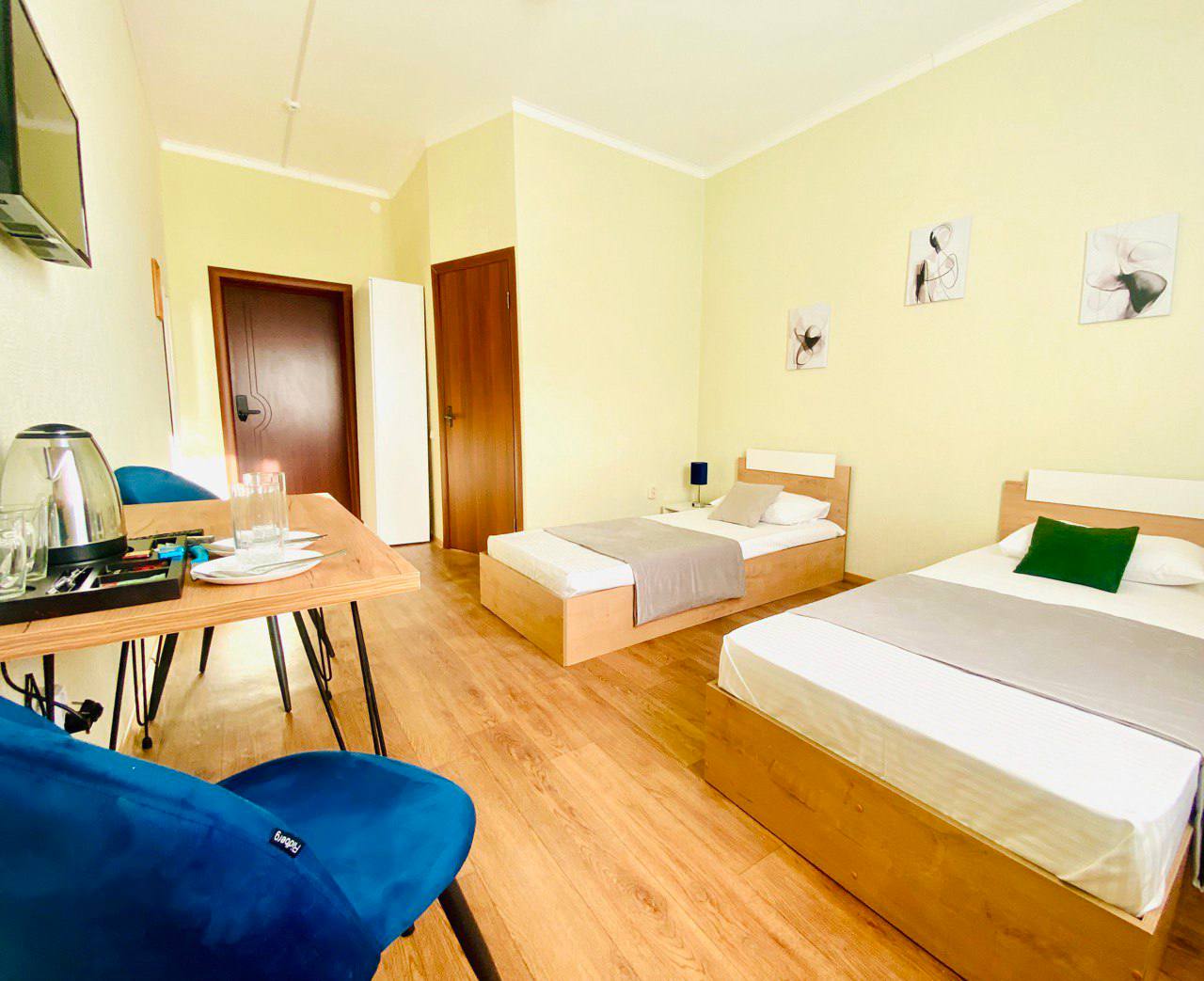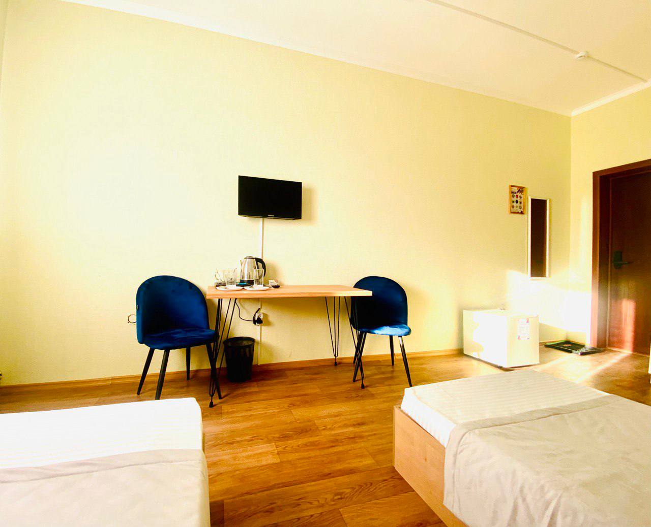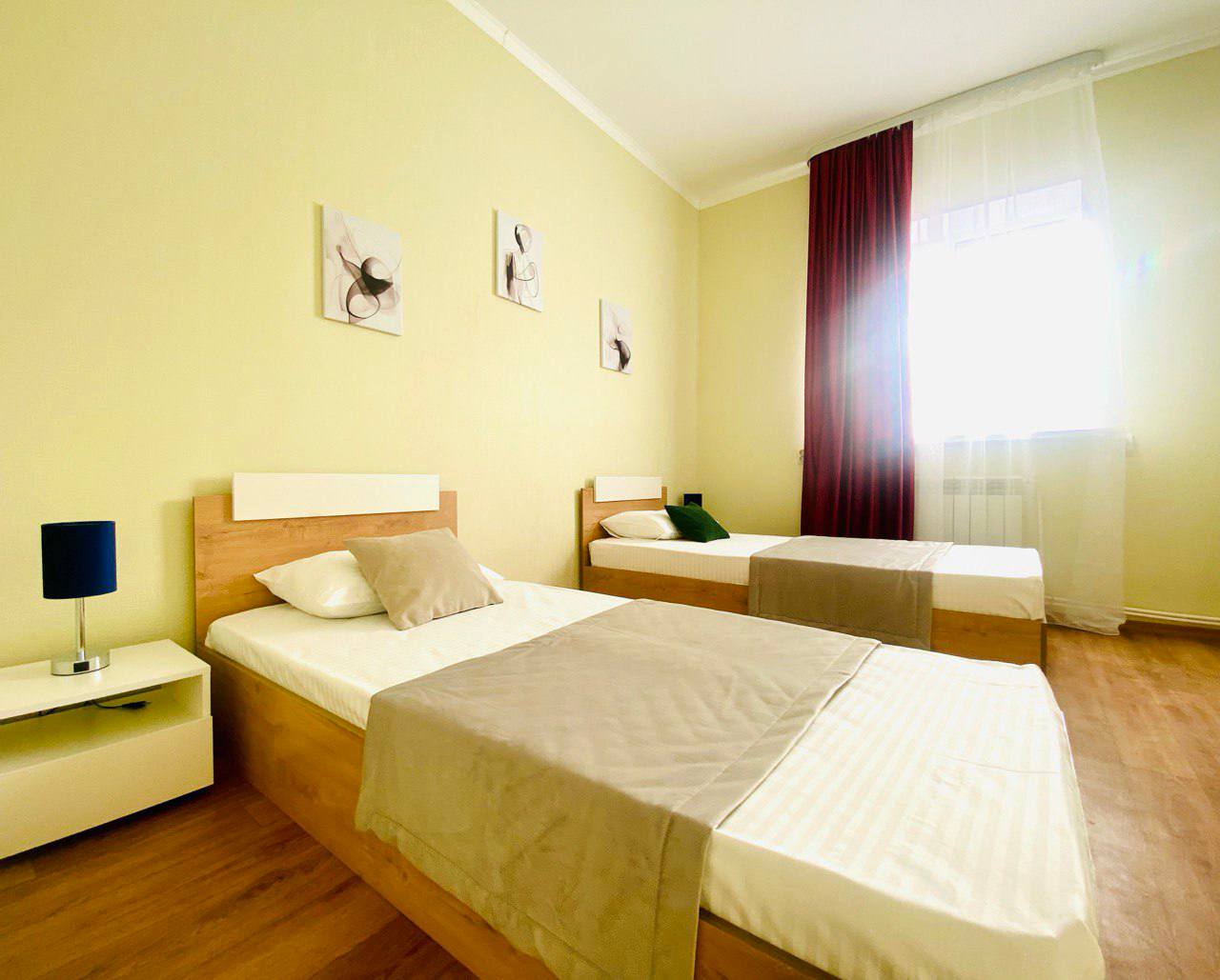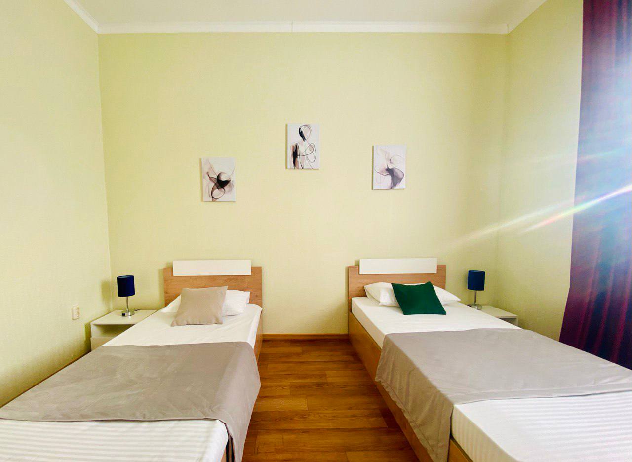 Уютный номер с 2 односпальными кроватями, со всем необходимым для проживания и санузлом.